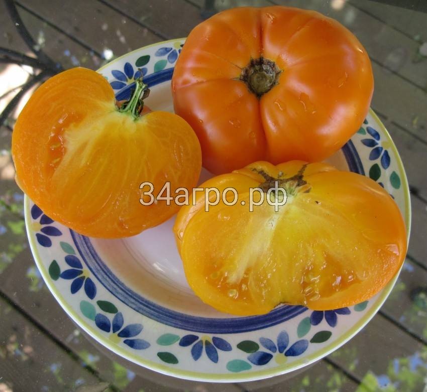Среднеспелый среднерослый сорт для выращивания в пленочных теплицах и открытом грунте с подвязкой к кольям. Растение детерминантного типа (с ограниченным ростом), высотой 70-100 см. Плоды плоскоокруглые, золотисто-оранжевые, массой до 300 г, с нежной мякотью, содержат много каротина. Благодаря сбалансированному содержанию сахара и органических кислот очень приятного вкуса. Плоды прекрасно подойдут для приготовления свежих летних салатов. Сорт отличается продолжительным плодоношением. Посев на рассаду — в конце марта-начале апреля. Пикировка — в фазе первого настоящего листа. Высадка в грунт — в конце мая-начале июня. Подвязка, регулярные подкормки, сбор плодов в бланжевой спелости с последующим дозариванием увеличивает выход урожая до 3,0кг с растения.