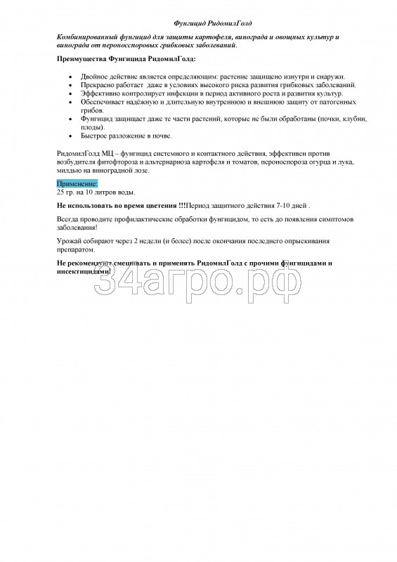 РИДОМИЛ ГОЛД МЦ, ВДГ не смывается дождем после полного высыхания обработанной поверхности.