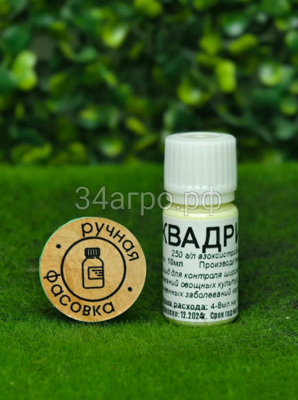 Квадрис, СК (суспензионный концентрат) - содержит 250 гр/кг азоксистробина. Фунгицид от компании Syngenta для защиты овощных культур и винограда от широкого спектра грибковых болезней. Препарат оказывает антиспорулирующее и ингибирующее влияние на прорастающие спор патогена, действует как на внешней стороне листа, так и внутри его.