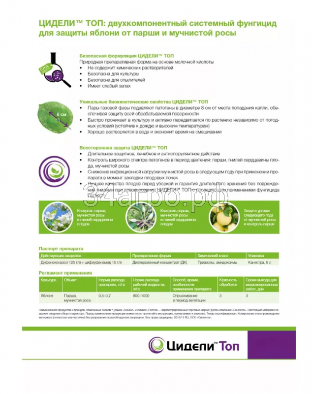 Фунгицид для защиты яблони от парши и мучнистой росы в самые критические фазы развития болезней.