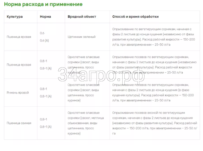 Пшеница яровая | 0,8-1 0,8-1 (А) | Однолетние злаковые сорняки (овсюг, виды щетинника, просо куриное) | Опрыскивание посевов по вегетирующим сорнякам, начиная с фазы 2 листьев до конца кущения (независимо от фазы развития культуры). Расход рабочей жидкости 150-200 л/га, при авиаприменении – 25-50 л/га |