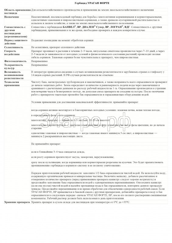 Уничтожает самые злостные сорняки (осот, пырей, свинорой, вьюнок и др и древесно-кустарниковую растительность. Обработанные сорняки не отрастают вновь! Содержит уникальные поверхностно-активные вещества, обеспечивающие более быстрое проникновение и перераспределение действующего вещества в растении. УРАГАН® форте работает значительно быстрее, чем другие гербициды на основе глифосата. Способ применения: перед обработкой не следует полоть и косить сорняки. Налить в ведро 1–2 л воды, вскрыть тубу, отмерить количество препарата в соответствии с таблицей, вылить в ведро с водой и тщательно перемешать, затем довести раствор до требуемого объёма и перемешать ещё раз. Раствор хранению не подлежит. Опрыскивать растения свежеприготовленным раствором в сухую безветренную погоду (дождь, прошедший ранее, чем за 6 ч после обработки, может смыть препарат и значительно снизить эффект), желательно утром или вечером, равномерно нанося на листья сорняков путем опрыскивания или смачивания листьев. Малотоксичен для пчел, рыб и других водных организмов. Преимущества перед другими гербицидами.