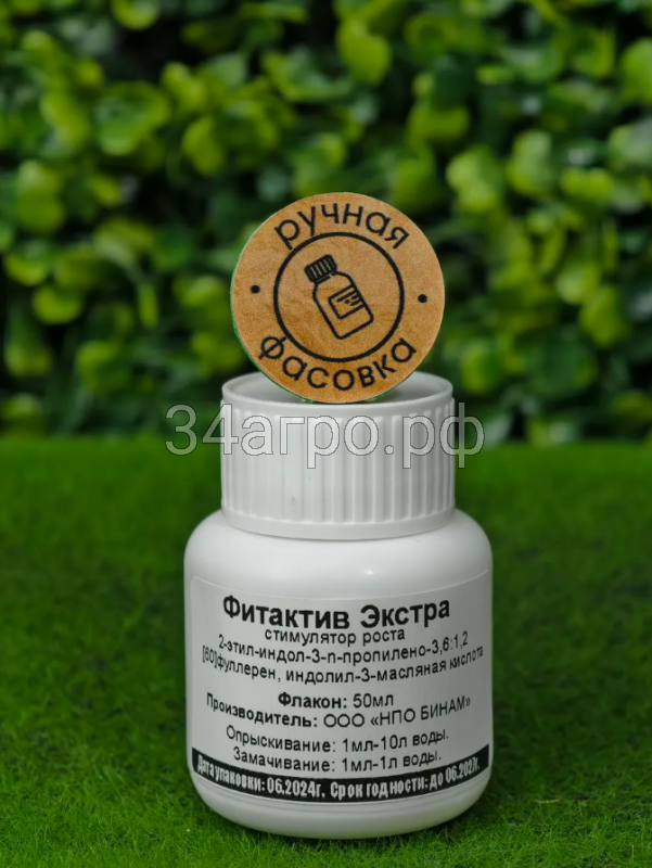 FITAKTIV Extra является стимулятором роста и адаптогеном, неспецифически действующим как на растительные клетки, так и на клетки грибов и бактерий, получен путём взаимодействия индолилмасляной кислоты с гидратированным фуллереном. Биологическое действие обусловлено ускоренным перемещением остатка ИМК к рецепторам за счёт высокого сродства молекулы фуллерена к биохимическим структурам.