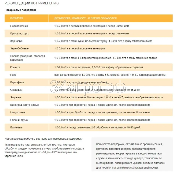 осенью (для озимого) 1,0-3,0 л/га в фазу 5-6 листьев, весной 1,0-3,0 л/га перед цветением