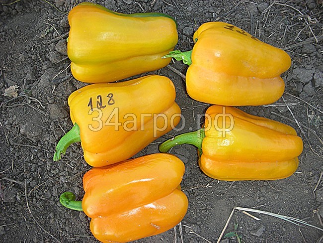 Высокие товарные и вкусовые качества плодов. Для открытого грунта и плёночных теплиц. Среднеспелый сорт. Период от всходов до плодоношения 110-115 дней. Высота растения в открытом грунте 70-75 см. Плод колоколовидной формы, трех-четырехгранный, высотой 12 см. Масса плода 120-170 г, толщина стенки 4,5-5,2 мм. В биологической спелости плод золотисто-желтый, технической спелости - зеленый. Сорт устойчив к вирусу табачной мозаики, вирусу картофеля (Y). Хорошо завязывает плоды при перепадах температуры воздуха. Универсальное использование.