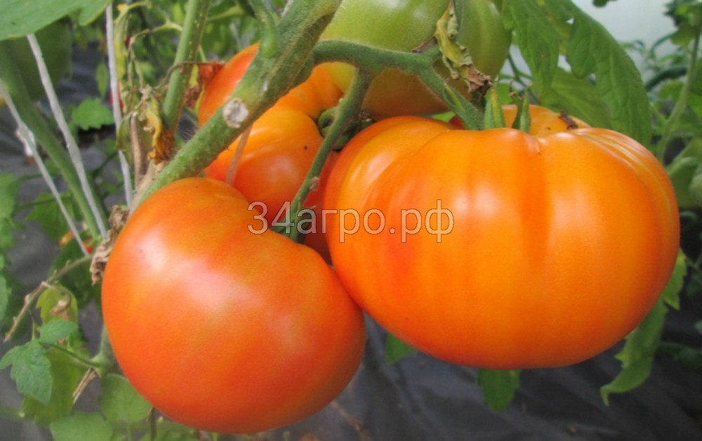 Плоды поражают не только уникальной оранжево-апельсиновой окраской с золотым напылением, но и размером, а также вкусом. Средняя масса малосемянного томата - 200-400 г! Мякоть сочная и мясистая, отменного сладкого вкуса. Нарезка и салатные дольки - сладкое украшение стола! Растение высокое индетерминантного типа. Первое соцветие закладывается над 9-11 листом, последующее - через 2-3. Плоды формируются в кистях по 3-5 шт. Среднеспелый сорт подходит для выращивания в пленочных теплицах и открытом грунте.