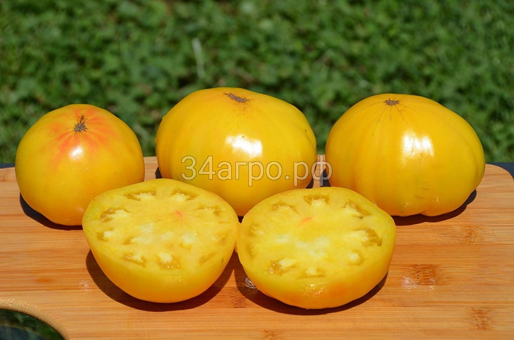 Среднеспелый (от полных всходов до начала созревания 109 дней) сорт салатного назначения. Растение индетерминантное, высота 120 -140 см. Первая кисть закладывается над 7-9 листом, последующие через 2-3 листа. Плоды плоскоокруглые, очень крупные, средней массой 300 г (отдельные до 900 г). В технической стадии – светло-зеленые с пятном у плодоножки, при созревании – желтые. Вкусовые качества хорошие. Рекомендуется для выращивания в открытом грунте как коловая культура. Агротехника. Посев на рассаду. Глубина заделки семян 1-2 см. При оптимальной температуре 20…25°С всходы появляются через 5 дней. Пикировка в фазе 2-3 настоящих листьев. Уход за растениями заключается в поливах по мере необходимости (особенно важно поливать томат перед цветением, с появлением завязей и вначале созревания плодов), прополках, рыхлении, подкормках.